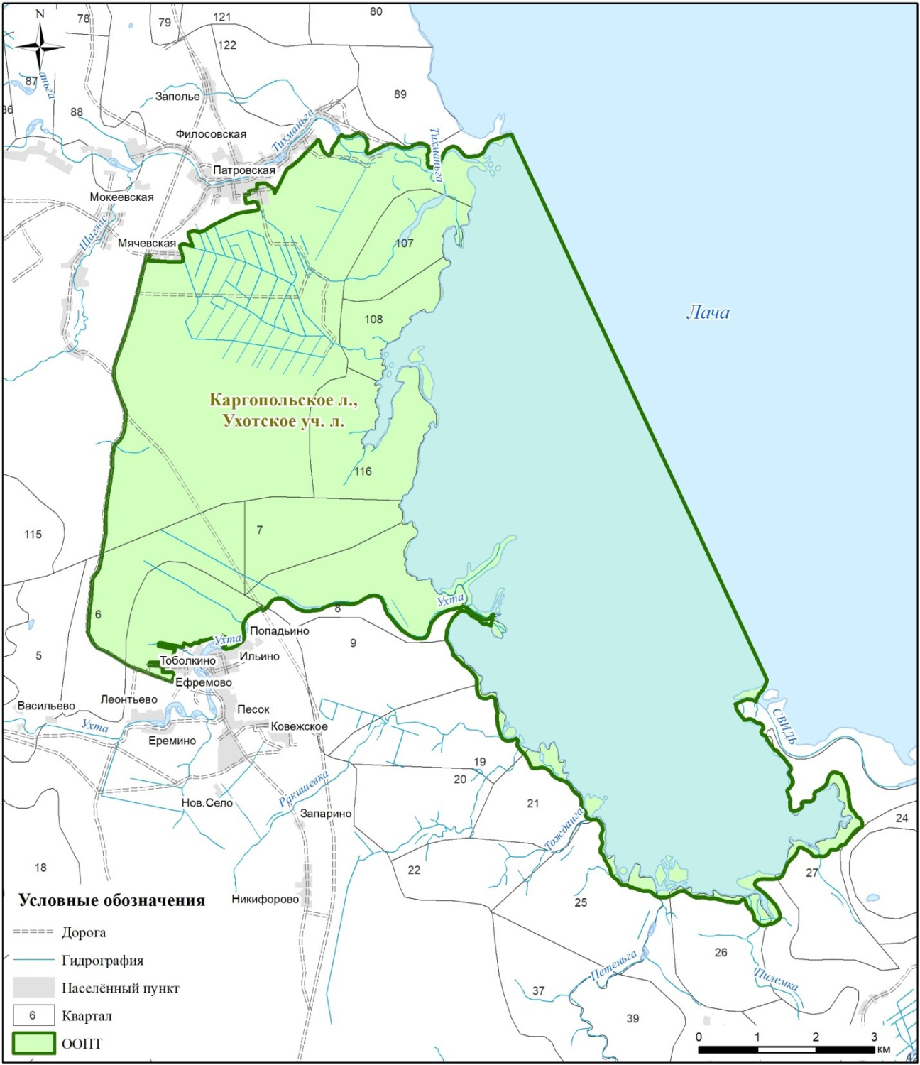 по береговой линии озера Лача до правого берега устья реки Ухта, далее вверх по течению вдоль правого берега реки Ухта до моста автомобильной дороги общего пользования федерального значения «Лодейное Поле – Вытегра – Прокшино – Плесецк – Брин-Наволок». Далее по левому берегу реки Ухта до границы дер. Тоболкино. Далее по северной и западной границам деревень Тоболкино и Ефремово до полосы отвода автомобильной дороги общего пользования «Песок – Никифорово»;