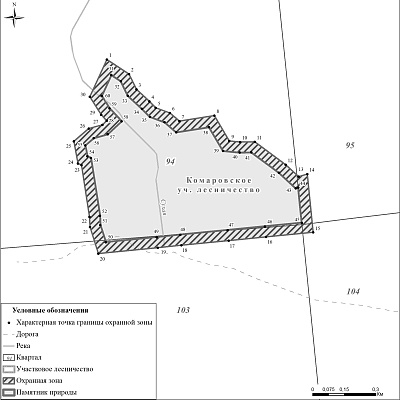 Для предотвращения неблагоприятных антропогенных воздействий на памятник природы на прилегающих к нему земельных участках и водных объектах установлена охранная зона шириной 50 м. Внешняя граница охранной зоны проходит параллельно границе памятника природы, который расположен в Красноборском муниципальном округе Архангельской области в границах выделов 64, 73, 76, 83, 84 квартала 94 Комаровского участкового лесничества Красноборского лесничества.