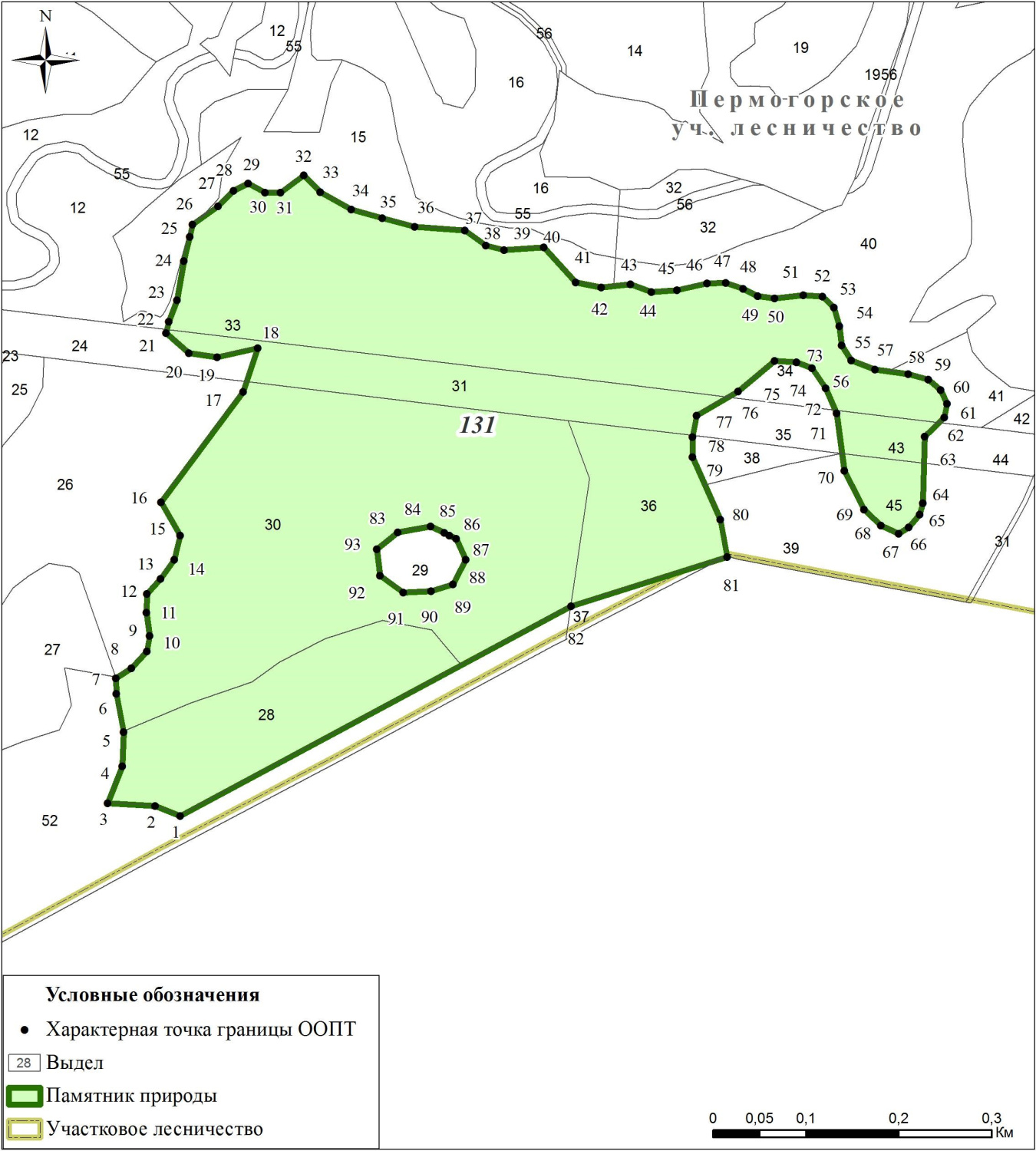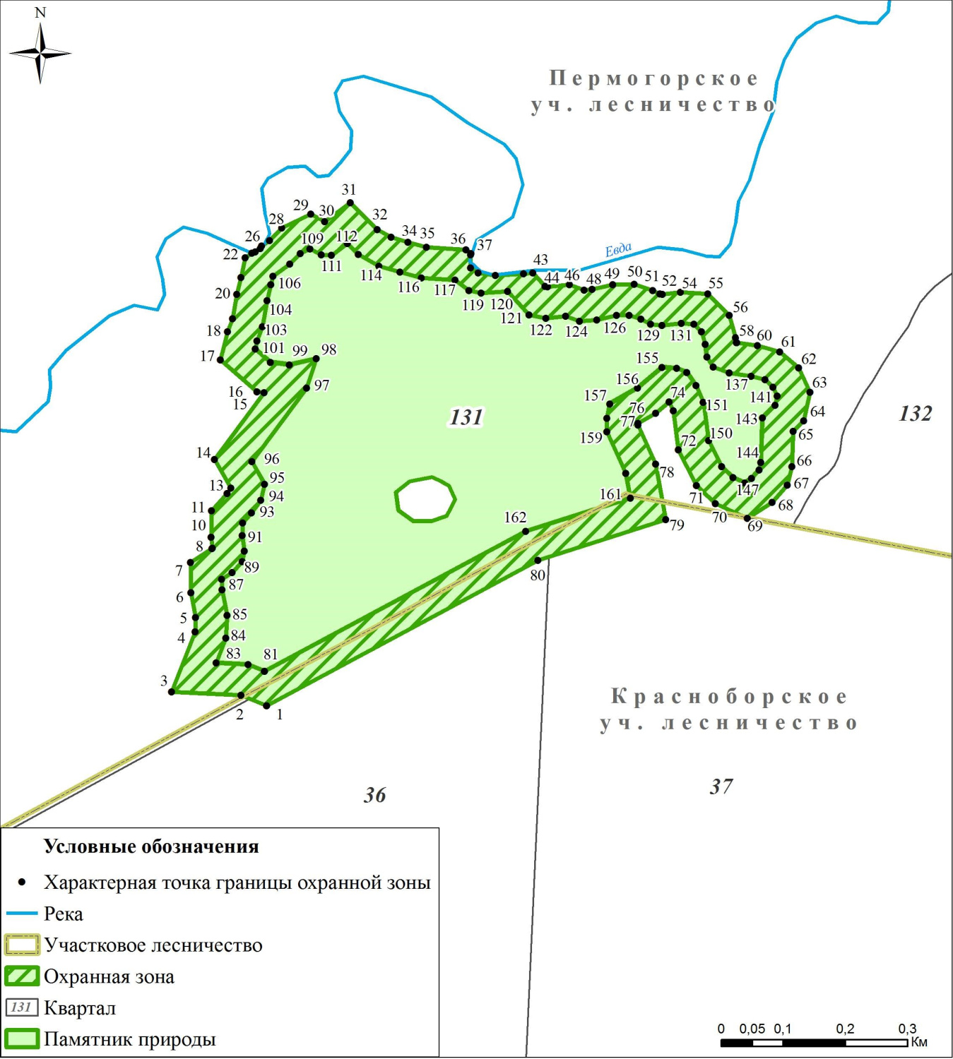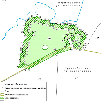 Для предотвращения неблагоприятных антропогенных воздействий на памятник природы на прилегающих к нему земельных участках установлена охранная зона шириной 50 м. Внешняя граница охранной зоны проходит параллельно границе памятника природы, который расположен в Красноборском муниципальном округе Архангельской области в границах выделов 28, 30, 31, 33, 36, 43 и 45 квартала 131 Пермогорского участкового лесничества Красноборского лесничества.