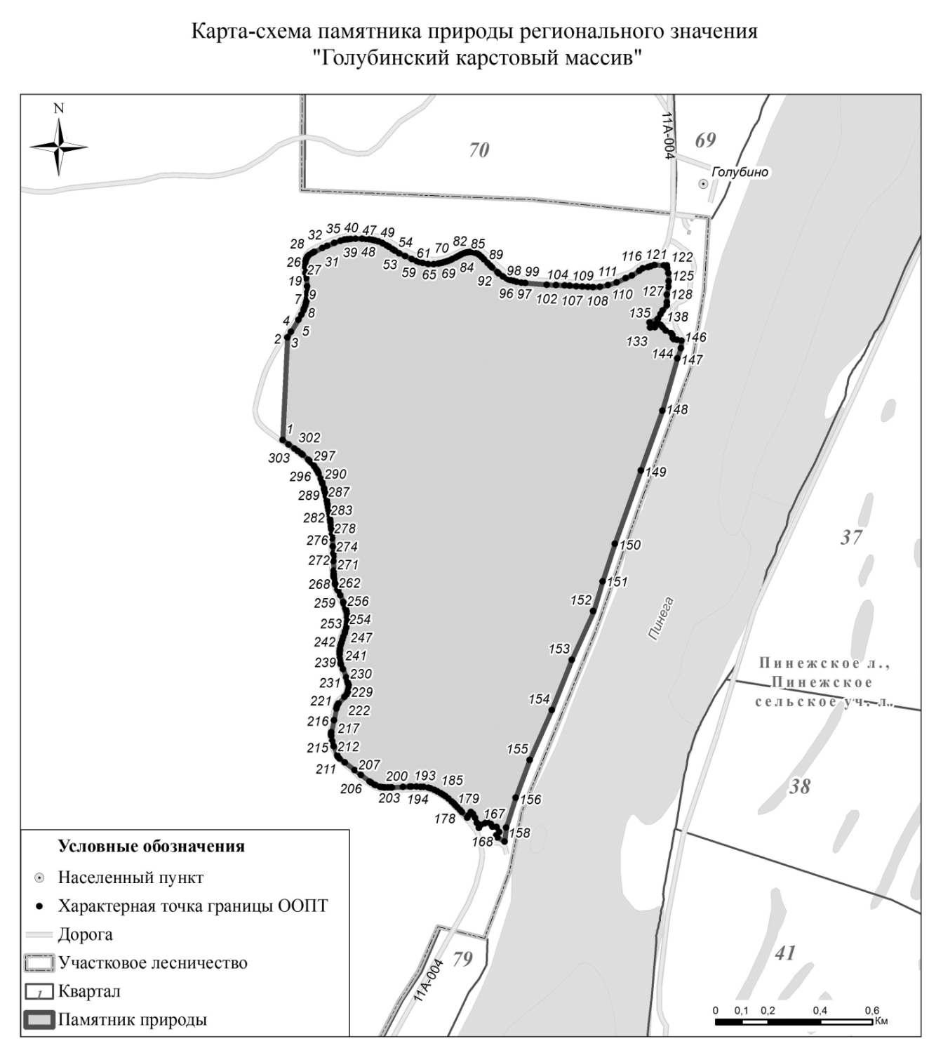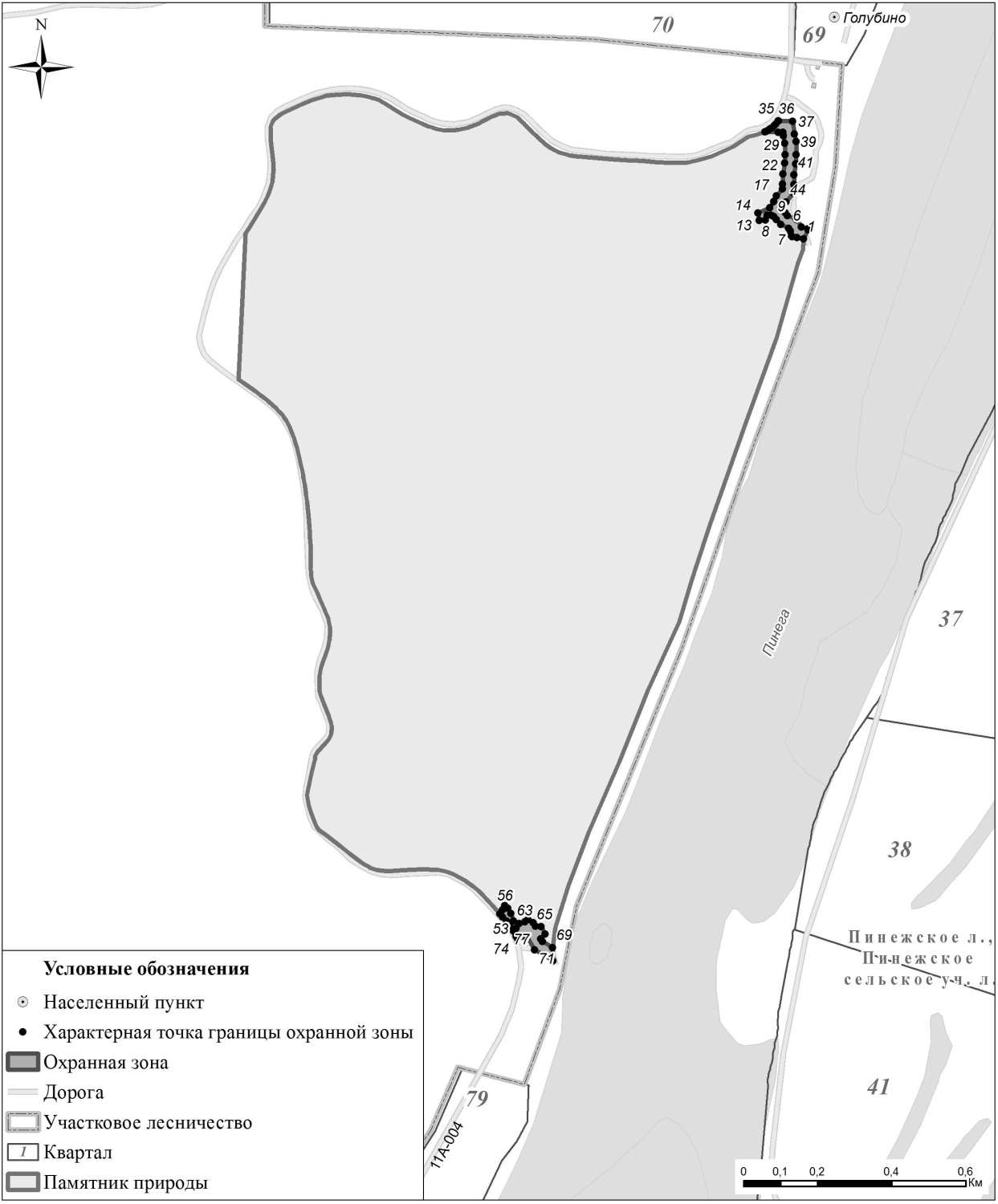- западная - от пересечения Пехоровского ручья с автодорогой Пинега - Архангельск по полосе отвода автодороги до пересечения с восточной просекой квартала 48 федерального государственного учреждения «Государственный природный заповедник «Пинежский», далее вдоль восточной просеки квартала 48 ФГБУ «Государственный природный заповедник «Пинежский» до пересечения с полосой отвода автодороги Пинега-Архангельск и далее вновь по полосе отвода автодороги до поселка Голубино.