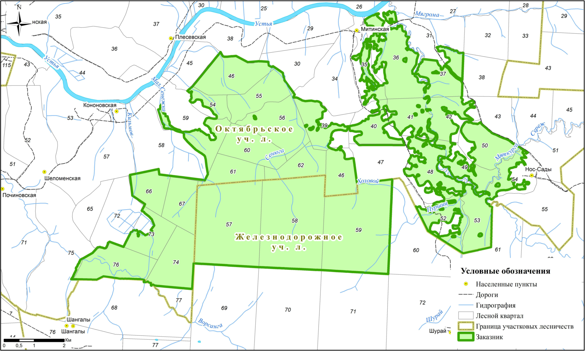 Заказник расположен в границах кварталов 57-59 участка Железнодорожное Железнодорожного участкового лесничества, кварталов 46, 54-56, 59-62, 66, 67, 73, 74, 76 участка совхоза «Устьянский» Октябрьского участкового лесничества и кварталов 35-37, 39-42, 46, 48-50, 52-54 участка совхоза «Орловский» Октябрьского участкового лесничества на землях лесного фонда.
