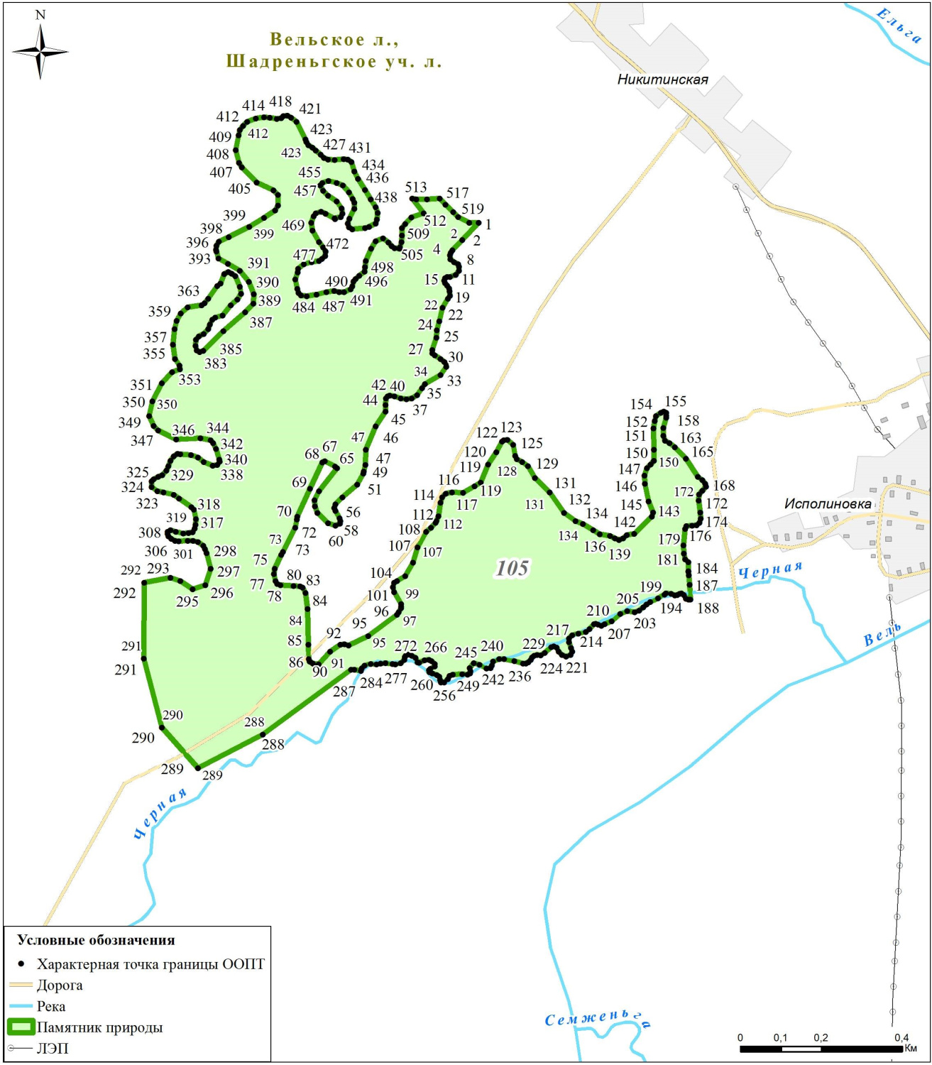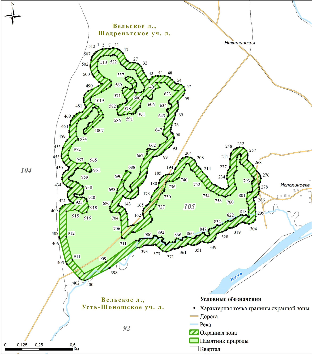 Для предотвращения неблагоприятных антропогенных воздействий на памятник природы на прилегающих к нему земельных участках установлена охранная зона шириной 50 м. Внешняя граница охранной зоны проходит параллельно границе памятника природы, который расположен в Вельском муниципальном округе Архангельской области в 47 км от г. Вельска в северо-западном направлении недалеко от поселка Исполиновка (в границах выделов 2 – 7, 11, 14, 16 – 18 и части выделов 8 – 10, 12, 15 квартала 105 Шадреньгского участкового лесничества Вельского лесничества).