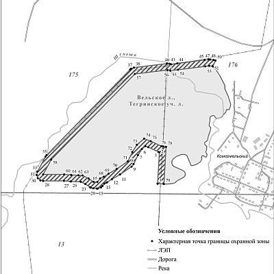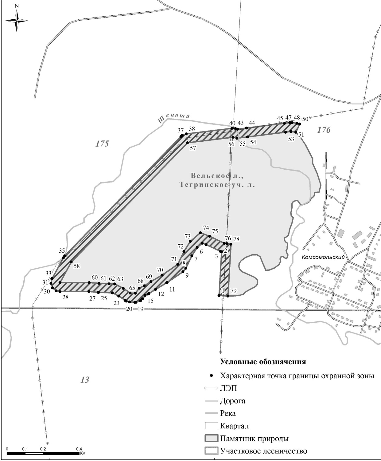 Для предотвращения неблагоприятных антропогенных воздействий на памятник природы на прилегающих к нему с южной, западной и северной сторон земельных участках установлена охранная зона шириной 50 м. Внешняя граница охранной зоны проходит параллельно границе памятника природы, который расположен в Вельском муниципальном округе Архангельской области приблизительно в 90 км от г. Вельска в северо-западном направлении рядом с пос. Комсомольский (в границах выделов 32 - 34, 43 квартала 175, выделов 19, 27 - 30, 32, 40, 42, 43, 45, 47, 53, 55, 57, 59, 61 квартала 176 Тёгринского участкового лесничества Вельского лесничества). С восточной стороны граница охранной зоны не устанавливается по причине примыкания памятника природы к пос. Комсомольский.