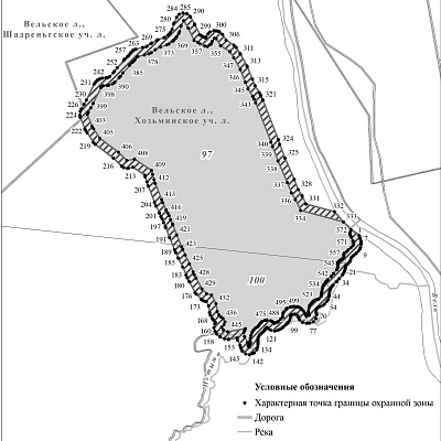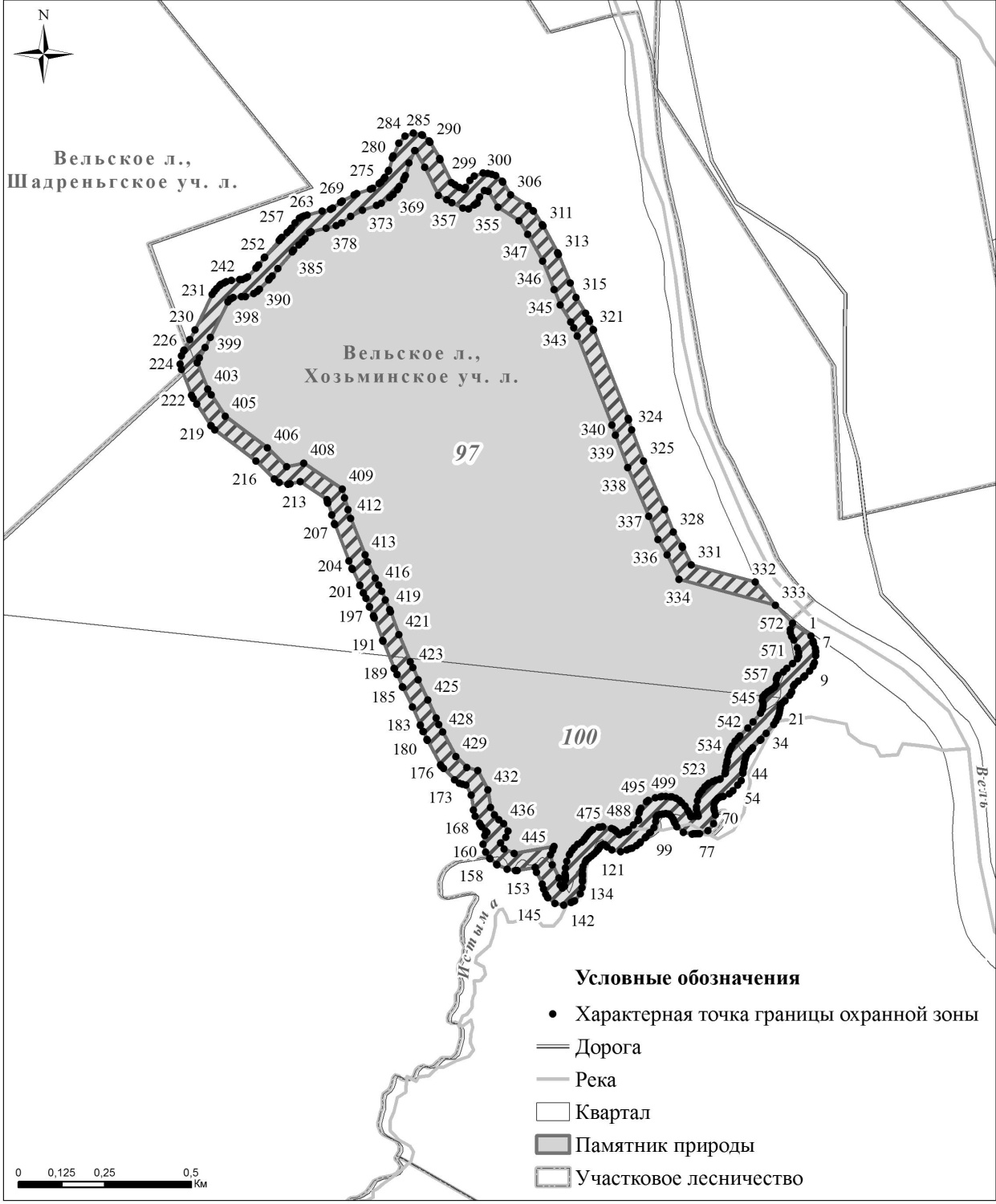 Для предотвращения неблагоприятных антропогенных воздействий на памятник природы на прилегающих к нему земельных участках установлена охранная зона шириной 50 м. Внешняя граница охранной зоны проходит параллельно границе памятника природы, который расположен в Вельском муниципальном округе Архангельской области в 40 км от г. Вельска в северо-западном направлении на правом берегу реки Вель, на противоположной стороне находятся населенные пункты Шунема и Березник. Южная часть памятника природы ограничена рекой Истыма. Памятник природы расположен в границах квартала 97 (выделы 42 – 46, 48 – 55, 57 – 63, 65, 66, 74, 76 – 80, 89 – 91, 98) и квартала 100 (выделы 12 – 18, 33, 60, 65, 66, 68) Хозьминского участкового лесничества Вельского лесничества