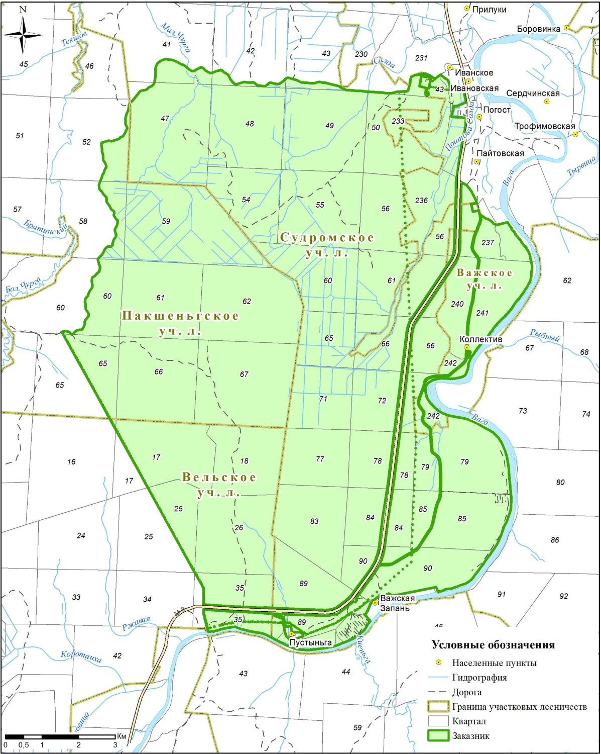 северная – от восточной просеки квартала 52 Пакшеньгского участкового лесничества Вельского лесничества по лесной дороге между деревней Ивановской и деревней Першинской, проходящей по кварталам 47, 41 – 43 Судромского участкового лесничества Вельского лесничества, и по северной границе квартала 233 Важского участкового лесничества Вельского лесничества до поселка Иванское, далее по западной и южной границам поселка Иванское до пересечения с западной границей полосы отвода автомобильной дороги общего пользования федерального значения М-8 «Холмогоры» Москва – Ярославль – Вологда – Архангельск;