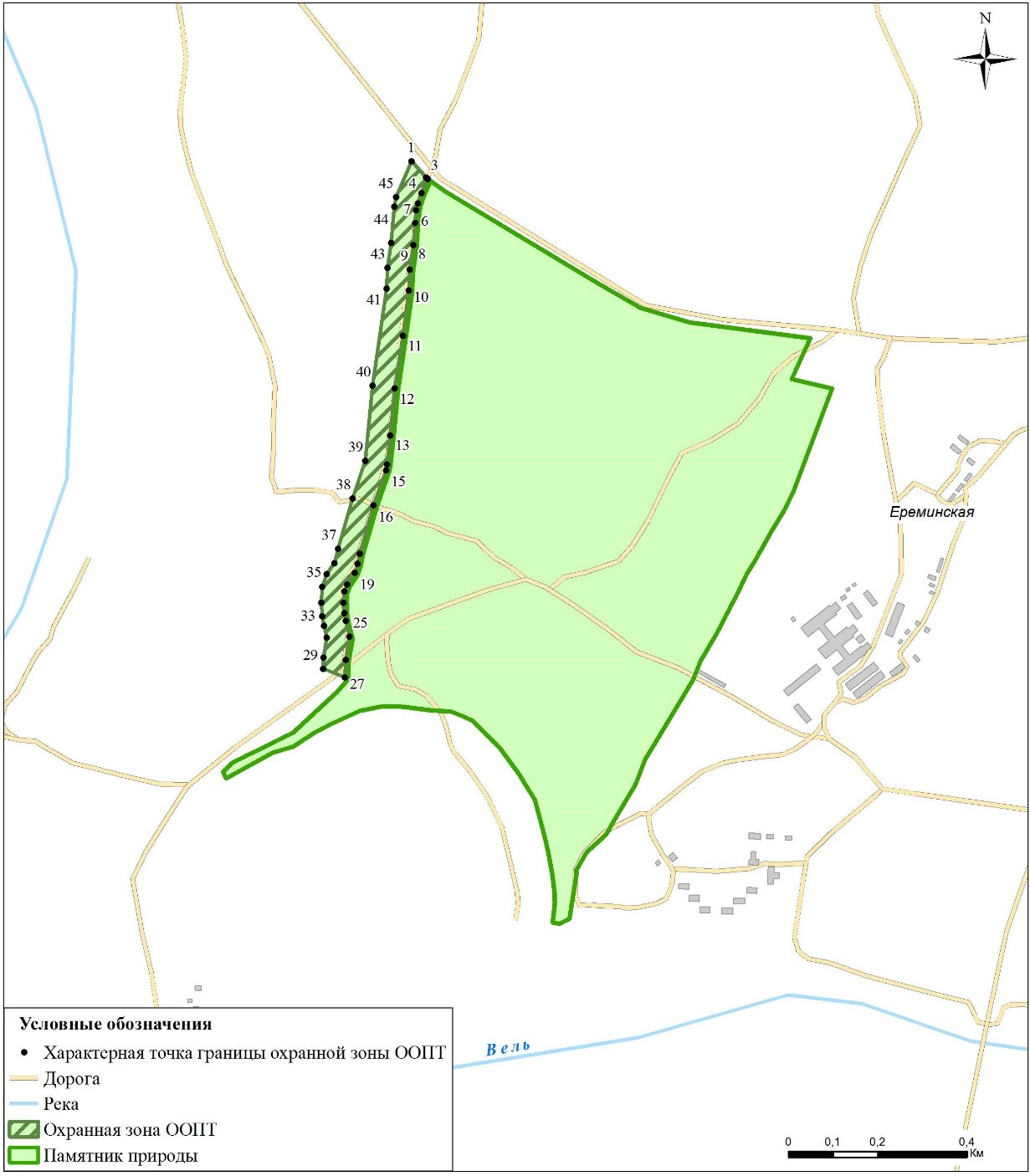 Для предотвращения неблагоприятных антропогенных воздействий на памятник природы на прилегающих к нему земельных участках установлена охранная зона шириной 50 метров. Внешняя граница охранной зоны проходит параллельно границе памятника природы, который расположен вблизи города Вельска, а также деревень Ереминской и Тарасовской Вельского муниципального района Архангельской области. На участках примыкания памятника природы к границам автомобильной дороги общего пользования регионального или межмуниципального значения «Вельск – Хозьмино – Шабаново – Комсомольский» и охранной зоне линии электропередач с северной, южной и восточной сторон охранная зона не устанавливается.