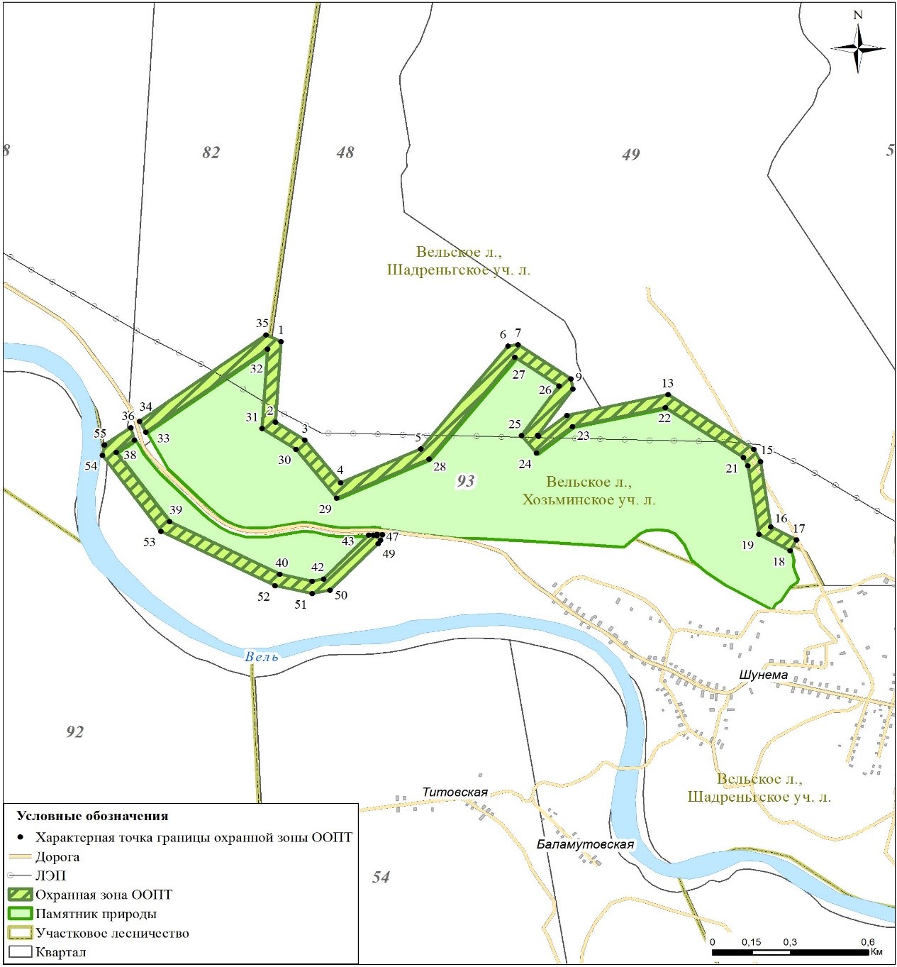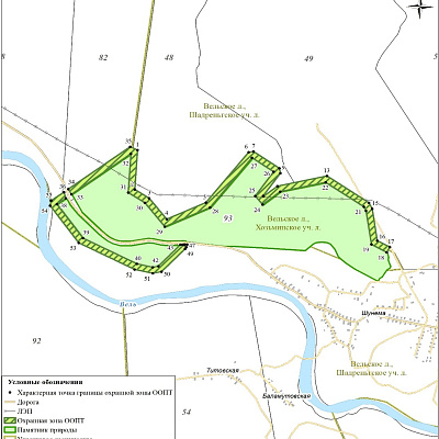 На участках примыкания памятника природы к границам населенного пункта и автомобильной дороге «Вельск – Хозьмино – Шабаново – Комсомольский» с юго-восточной и южной сторон охранная зона не устанавливается.