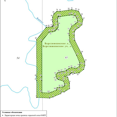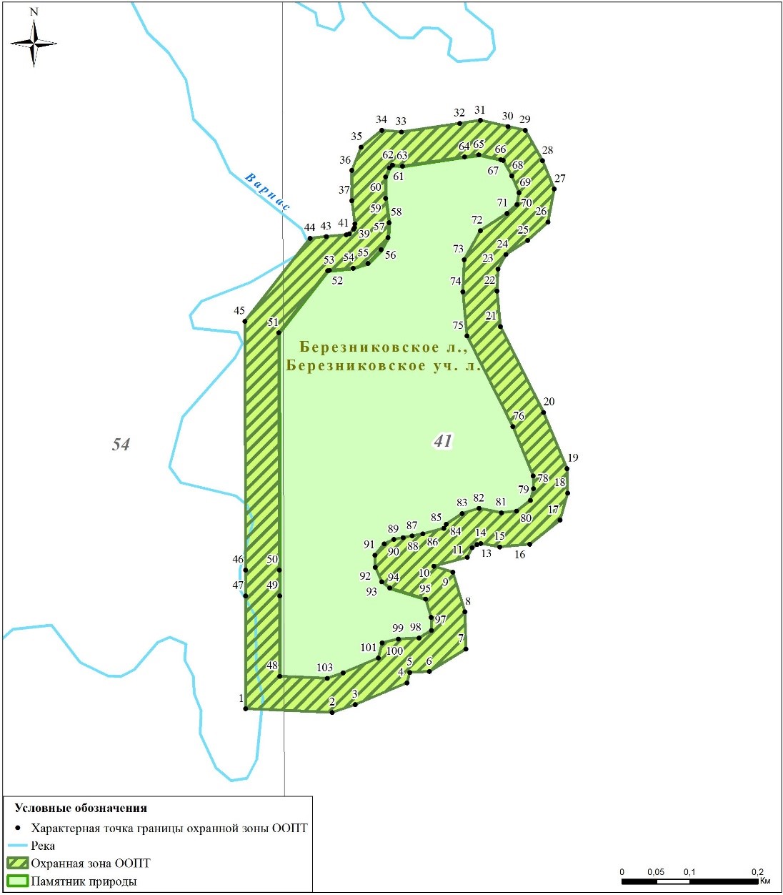 Для предотвращения неблагоприятных антропогенных воздействий на памятник природы на прилегающих к нему земельных участках и водных объектах установлена охранная зона шириной 50 метров. Внешняя граница охранной зоны проходит параллельно границе памятника природы, который расположен в Виноградовском муниципальном округе Архангельской области (в границах выделов 12, 13 квартала 41 Березниковского участкового лесничества Березниковского лесничества).
