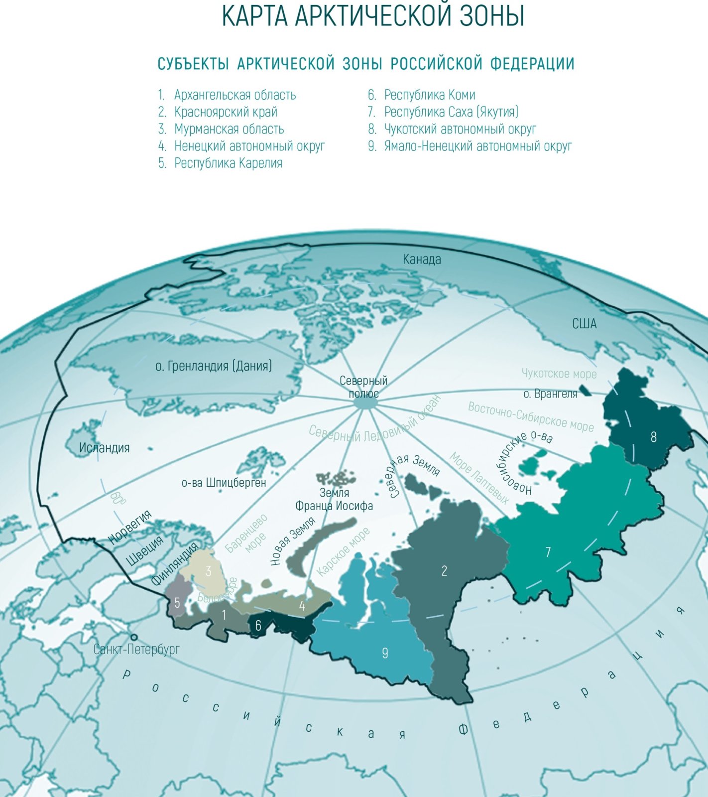 Российская территория Арктики начинается с Земли Франца-Иосифа на северо-западе и простирается до островов Врангеля и Геральд на востоке, составляя треть всей площади шельфа. Эти территории находятся под властью федерального законодательства и активно используются в экономических целях России. Кроме того, через территорию Северного полюса проходит Северный морской путь и Северный воздушный мост, связывающий Азию и Северную Америку.