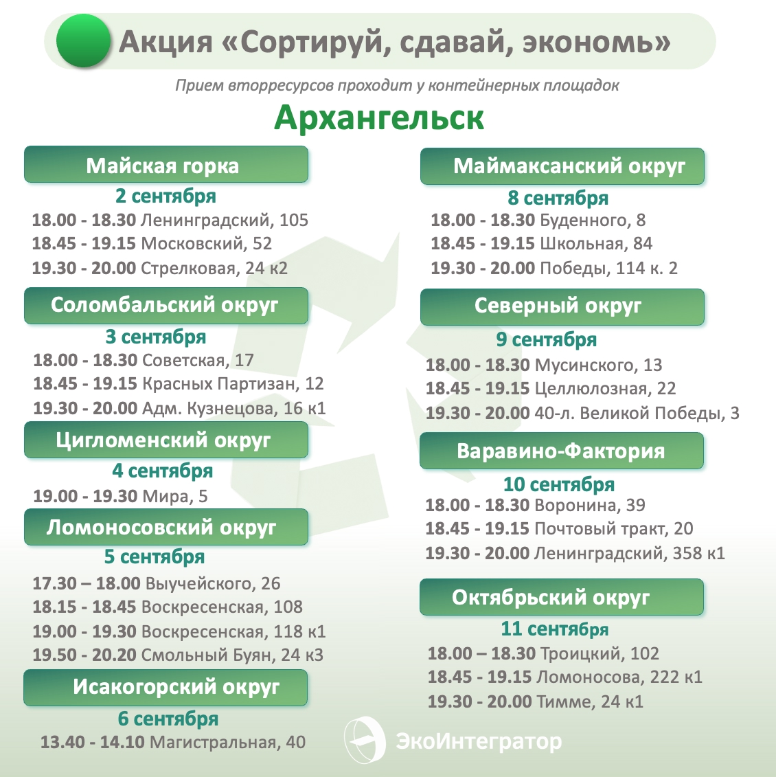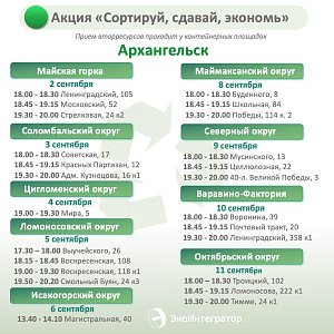 Акция пройдет в Архангельске, Северодвинске, Новодвинске и Приморском округе. С собой не забудьте взять квитанцию на услуги по обращению с ТКО.