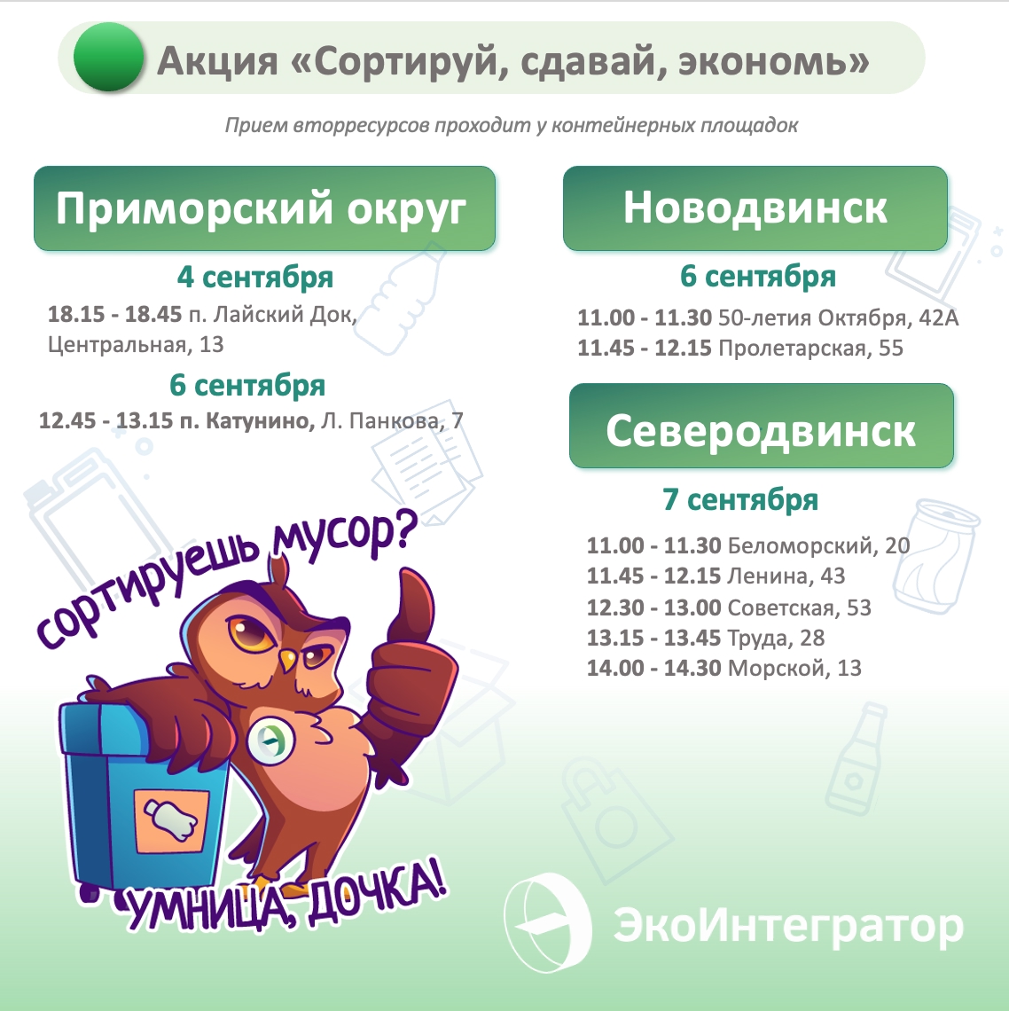 Сортируйте отходы и приносите на ближайшую контейнерную площадку из списка. Каждый килограмм вторсырья регоператор «ЭкоИнтегратор» обменяет на скидку 6 рублей в квитанции по обращению с ТКО.