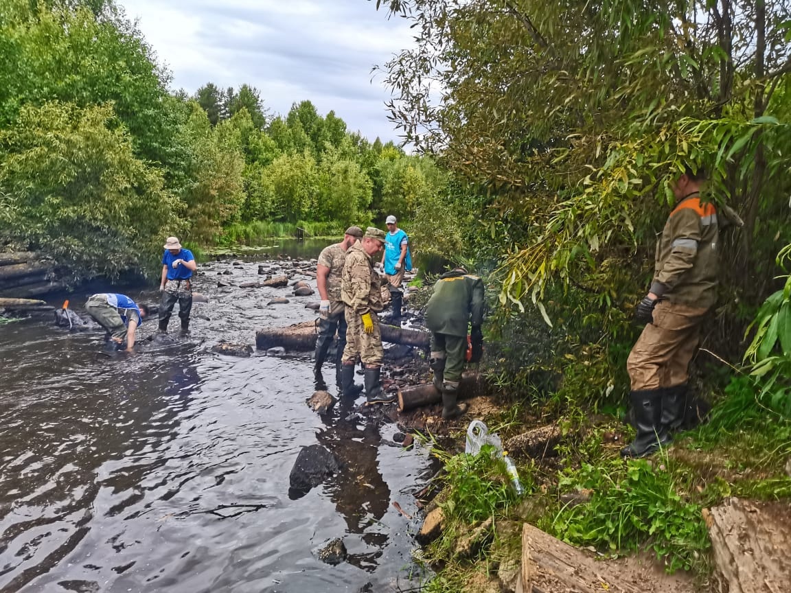 Участники акции извлекали из русла огромные старые бревна, древесную труху, ржавую арматуру, пластиковый мусор и многое другое. Общими усилиями удалось извлечь из русла реки более 5 кубометров отходов. Бревна и мусор, собранные участниками акции, при поддержке регоператора «ЭкоИнтегратор» вывезены на полигон.Фото: группа ВК минлеспром АО