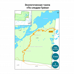 Экотропа знакомит с впечатлениями от жизни в архангельской ссылке А.С. Грина, автора известной повести «Алые Паруса» и романа «Бегущая по волнам», и его жены В.П. Гриневской. Тропа идёт по лесной дороге до системы Карась-озёр. Многочисленные заливы озёр с зарослями тростника и осоки благоприятны для гнездования водоплавающих птиц, таких как кряква, свиязь, чирок-свистунок, турпан.