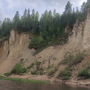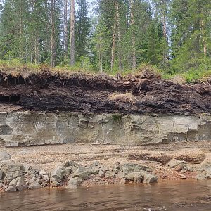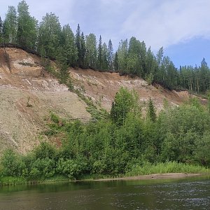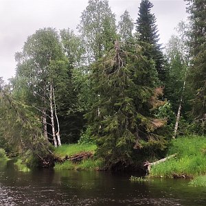 Э.В.: В эту экспедицию мы отправились вдвоём с государственным инспектором ОСП «Лачский биологический заказник» Русановым Виктором Сергеевичем. Наш путь из Архангельска с учётом двух ночёвок занял три дня: полтора дня на автомобиле повышенной проходимости и полтора дня на лодке с подвесным лодочным мотором. К сожалению, прошедшие дожди размыли грунтовые дороги так, что местами экскаватор помогал легковым автомобилям передвигаться по «дороге». Перемещение по реке Мезенская Пижма осуществлялось против течения, средняя скорость составила 16 км/ч, общий путь до заказника – около 140 км. Река изобилует излучинами, отмелями и перекатами, требующими особого внимания при передвижении. Путешествие по Мезенской Пижме запоминается её меняющимися речными ландшафтами: то это пойменные лугово-лесные долины, то высокие берега, обнажающие известковые или скальные породы. Река постоянно воздействует на берега, вызывая их эрозию. На всём пути тебя сопровождают, «покорённые» водой, склонившиеся и упавшие деревья, а также отрезанные как торт, почвы, демонстрирующие наполнение своих слоёв.