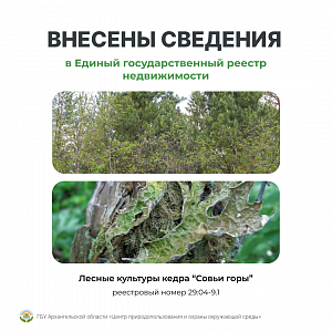 Согласно уведомлению филиала ППК «Роскадастр» по Архангельской области и Ненецкому автономному округу в ЕГРН внесены сведения о памятнике природы регионального значения «Лесные культуры кедра «Совьи горы» (реестровый номер 29:04-9.1)